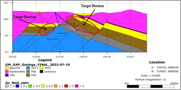 Additionally, drill plans are in place to test high potential targets in the Gap target area located north of the planned mining areas at Bullfrog where intense alteration, preserved lithocap and significant surface gold mineralization occur along a major fault corridor (see Figures 3 and 4). Two previously completed core drill holes (BFG21-IS39 1.02m of 1.74 g/t Au; BFG21-IS30 1.56m of 0.83 g/t Au) are interpreted to have drilled over the fault intersection with the favorable TR-8 host rock.
